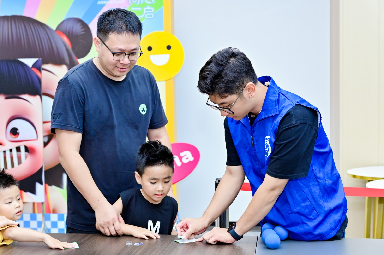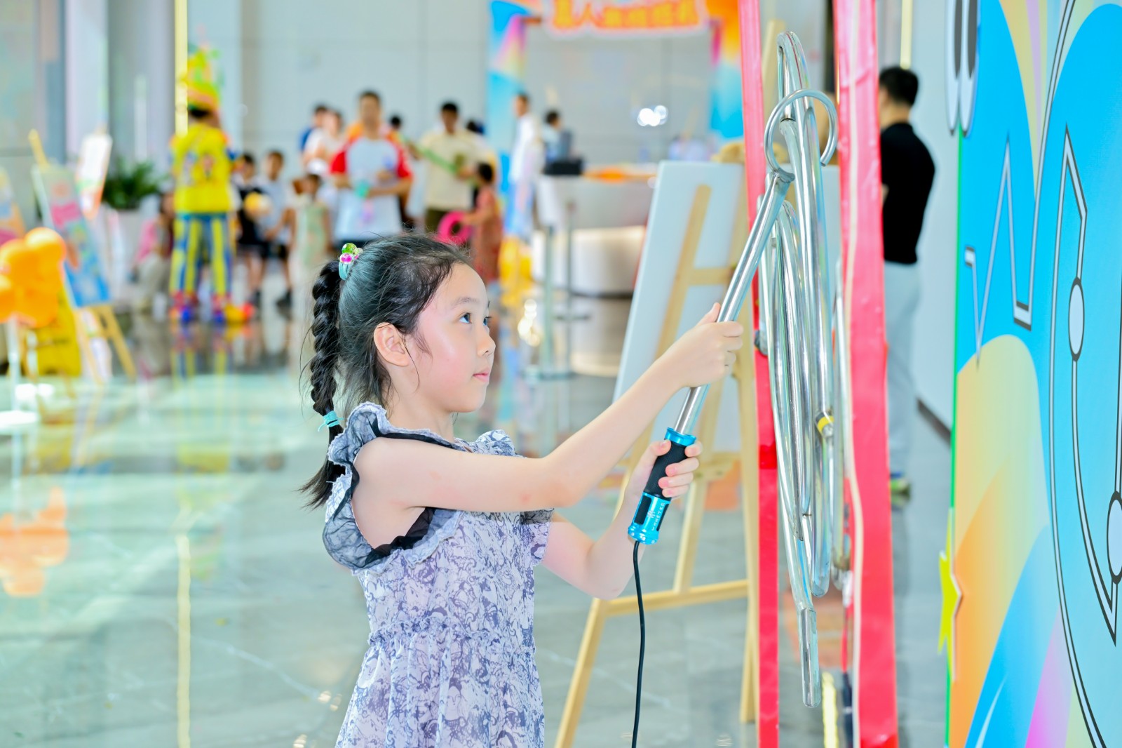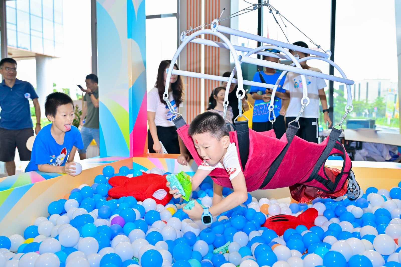 仪式的荣光未散,,,,,,,,科技园已切换为温情的共生图景。。。。。。。一楼的亲子游园会上,,,,,,,,非遗漆扇DIY的墨色在纱面晕开文化传承,,,,,,,,真人娃娃机中的欢声诠释着“聚光向WE来”的深意——“WE”既是员工家庭的小单位,,,,,,,,亦是医患同心、工业协力的弘大叙事。。。。。。。孩子们紧握集章卡兑换伴手礼的笑靥,,,,,,,,恰似企业温度最轻盈的注脚。。。。。。。