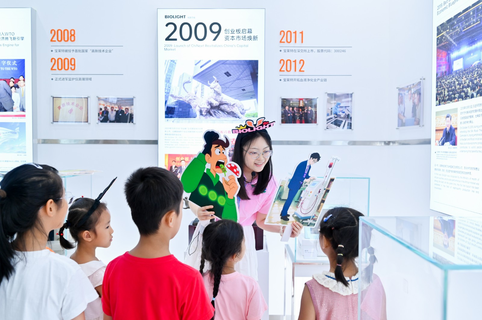 以童趣启智: 兔子姐姐手持 “邓小平南巡”“中国入世”卡通手举牌,,,,,,,,将企业史转化为“宝莱兔的时光旅行”。。。。。。。孩子们从LOGO的双手托起生命太阳中读懂守护生命的初心。。。。。。。